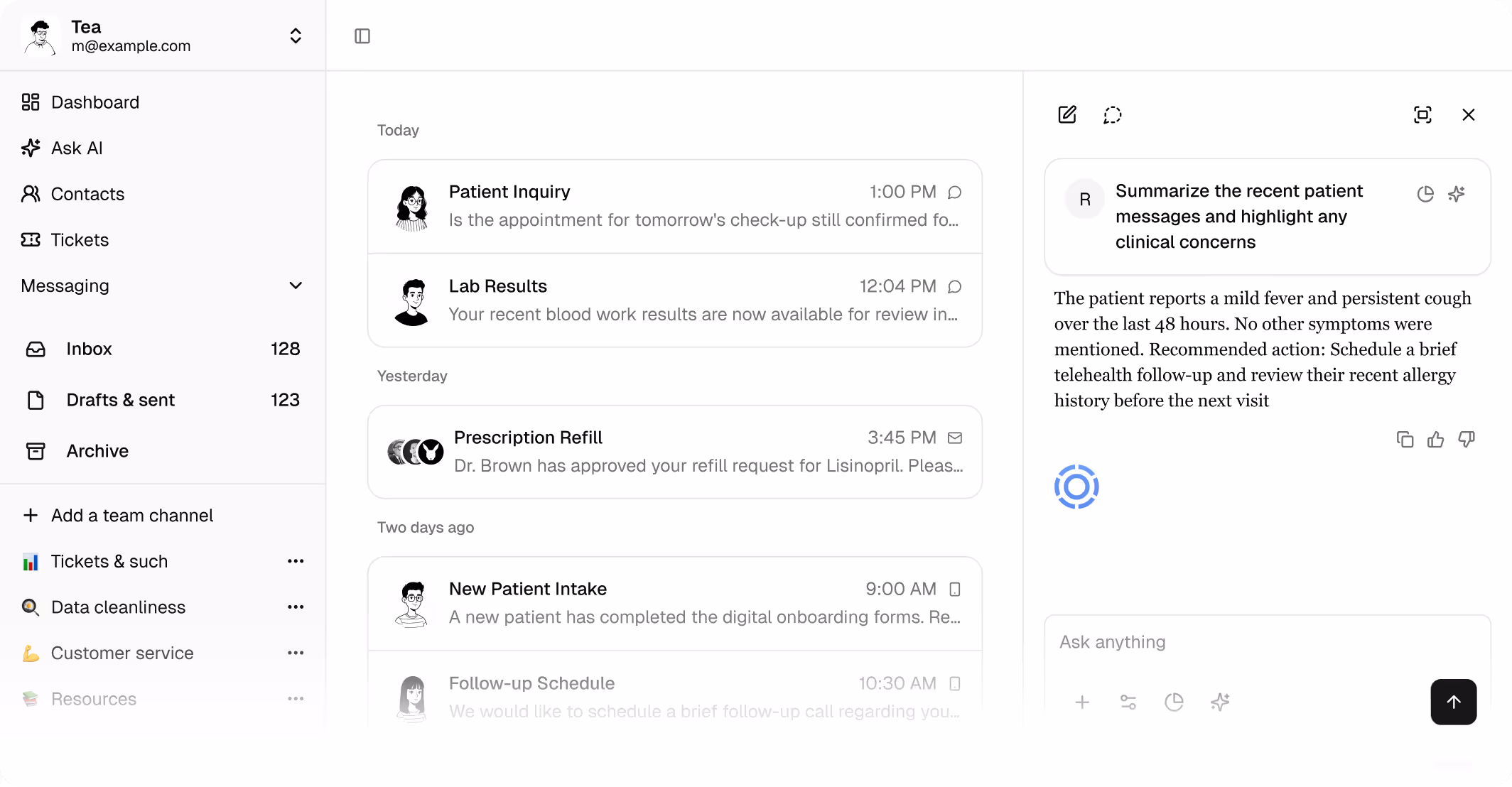 Automate ongoing check-ins, identify which patients need attention, and provide omnichannel support from a shared inbox.