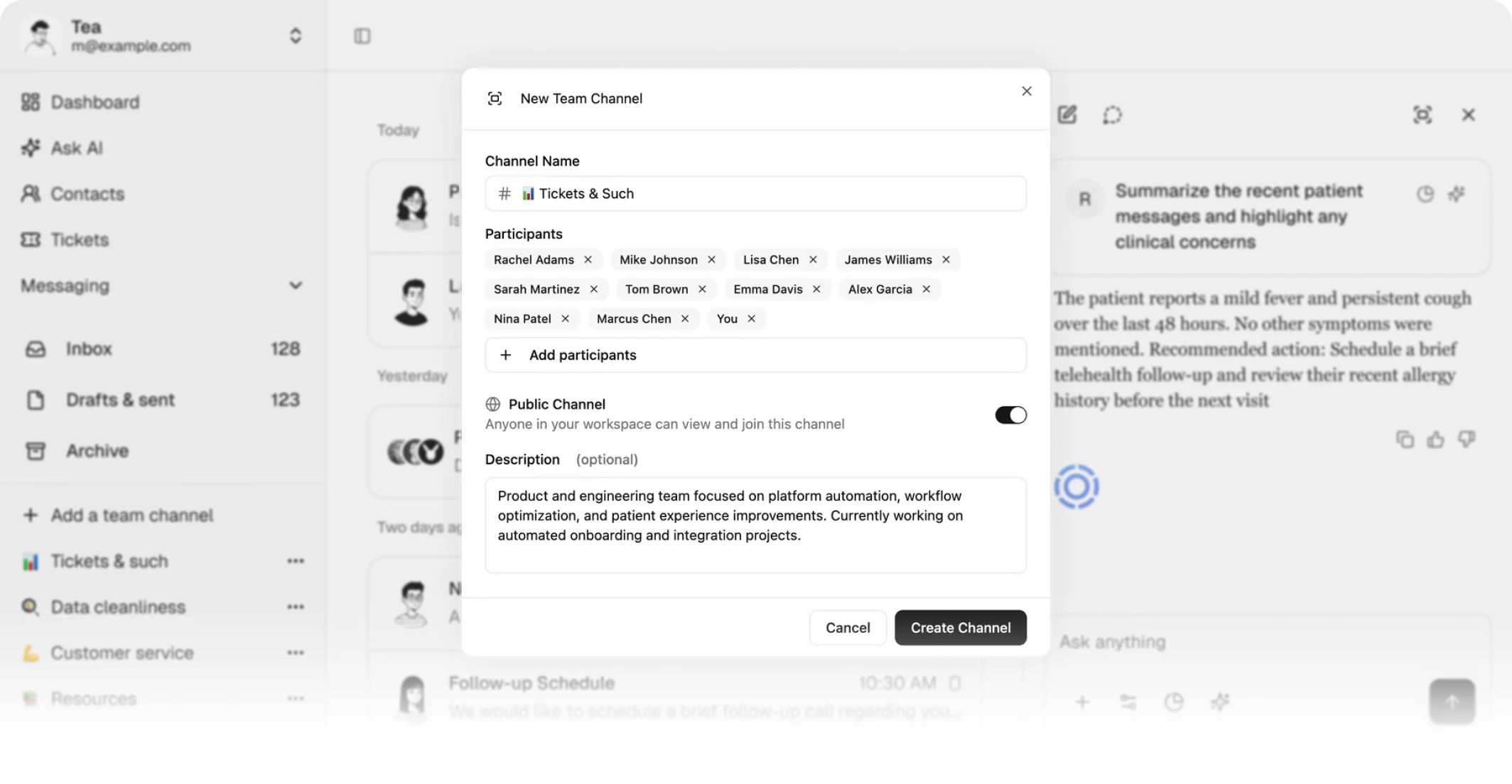 Organize internal collaboration through dedicated channels by department, patient cohort, or clinical program