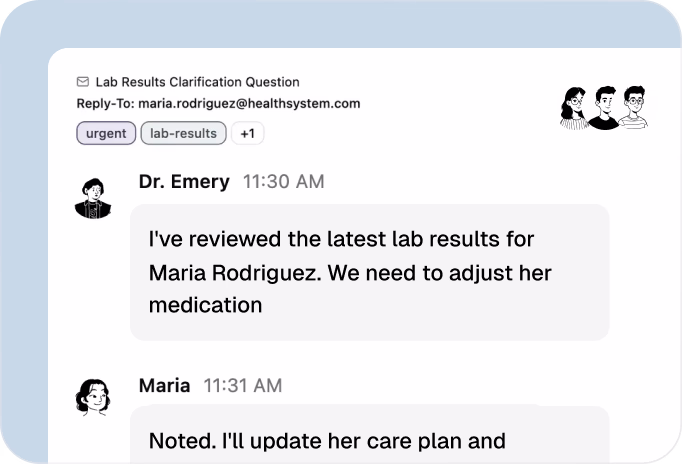 Coordinate complex care plans through HIPAA-compliant instant messaging. Share internal updates and clinical insights without jumping between platforms