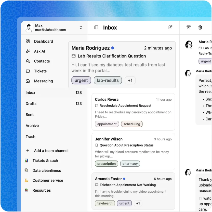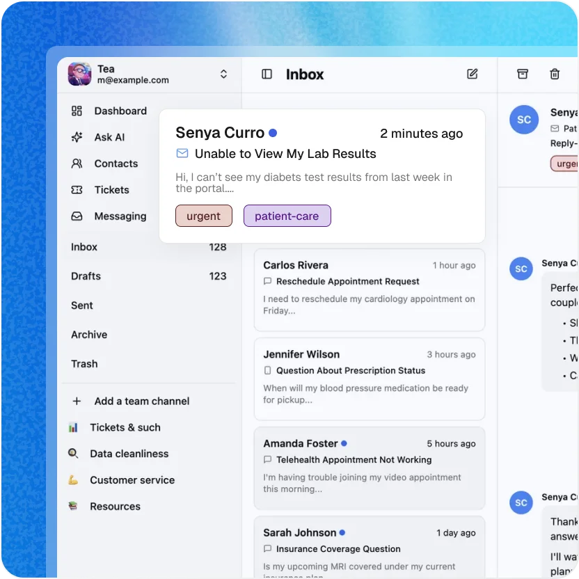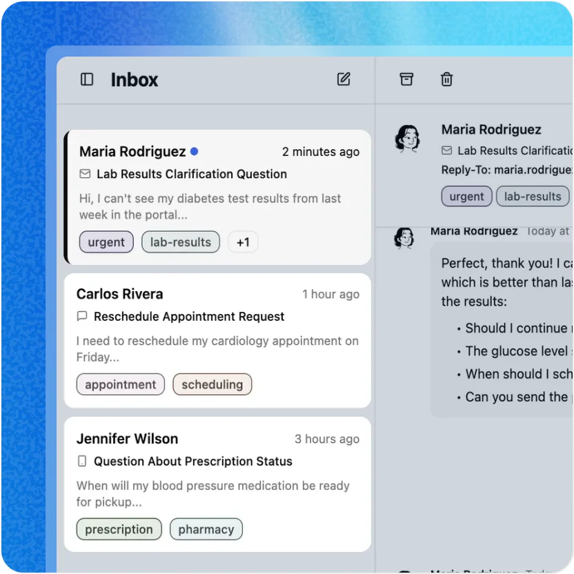 All incoming messages (sms, email, chat, calls) are automatically gathered in a single, hippa-compliant inbox, linked to the patient's profile for a complete history